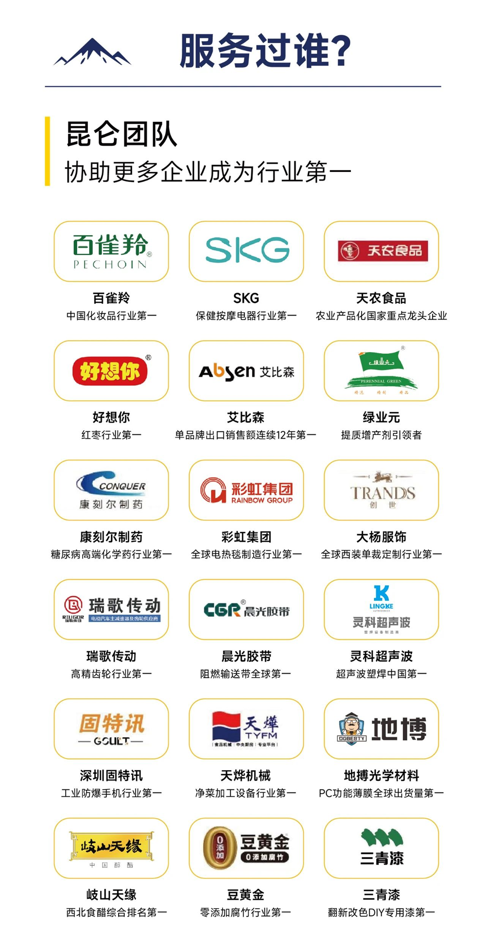 昆仑定位专注战略定位培训和咨询,是中国战略定位培训规模最大的公司,战略定位培训的领导者,每个月全国开课40-50场,累计培训学员超15万人+,昆仑是成美旗下的子公司,成美战略定位咨询——1998年成立,专注战略定位咨询28年,中国成功案例最多的战略定位咨询公司,收费600万起,每年服务大客户4-5个。服务客户有大家耳熟能详的,比如:怕上火喝王老吉,东鹏特饮,四川的通威,千禾酱油等,打造了139个行业数一数二的知名品牌。